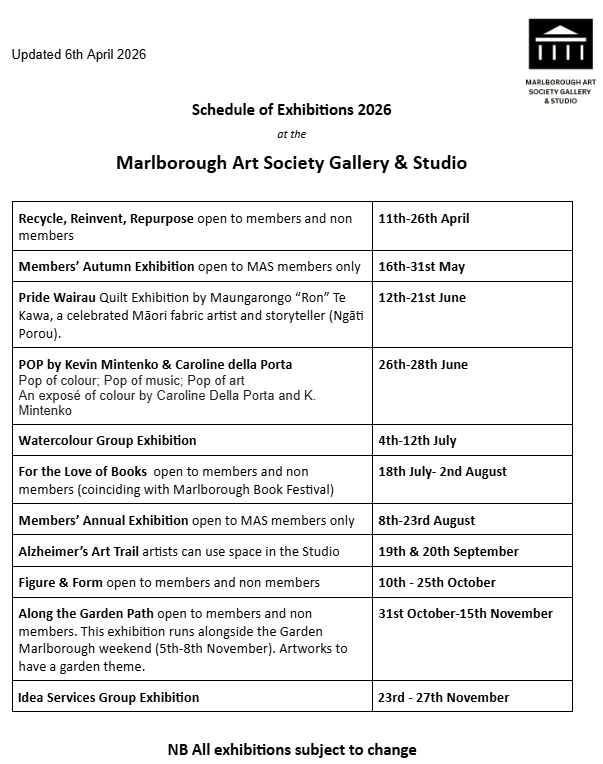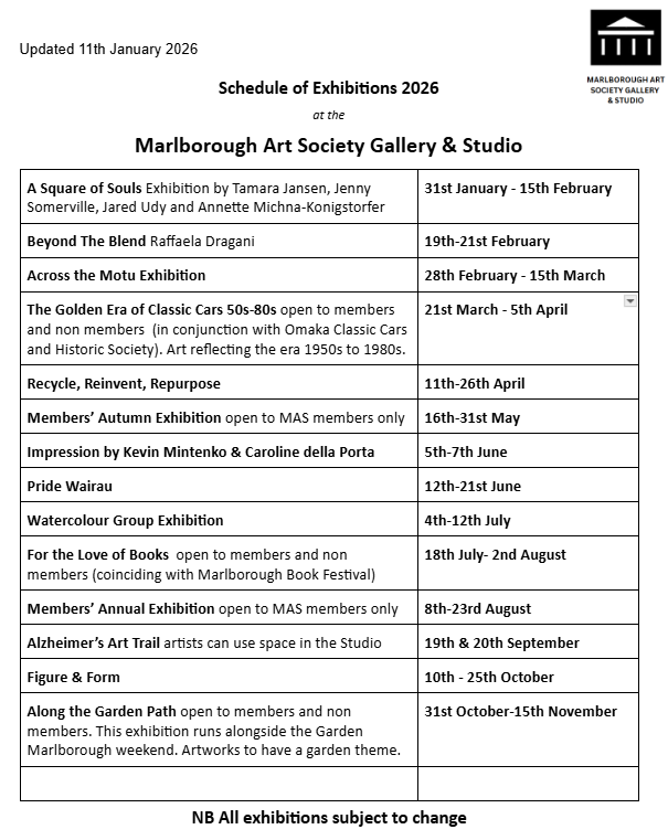 Come and visit the many interesting art exhibitions that the Marlborough Gallery present throughout the year. We look forward to seeing you here in Blenheim.